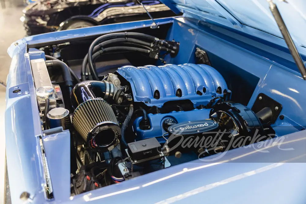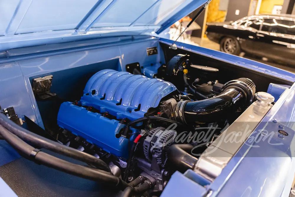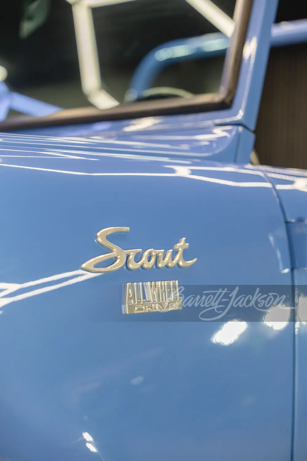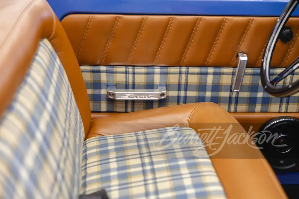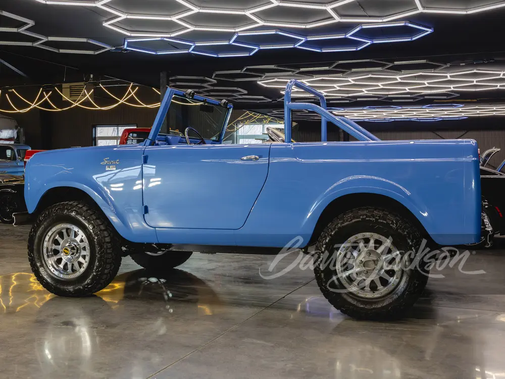 This 1962 International Scout 80 has been completely reimagined with a modern 420hp 6.2L L86 V-8 and 8-speed automatic transmission. Finished in a beautiful light blue exterior with a brown leather interior, it blends classic Scout styling with modern driveability. Features include power steering, power disc brakes, A/C, and a custom roll cage.