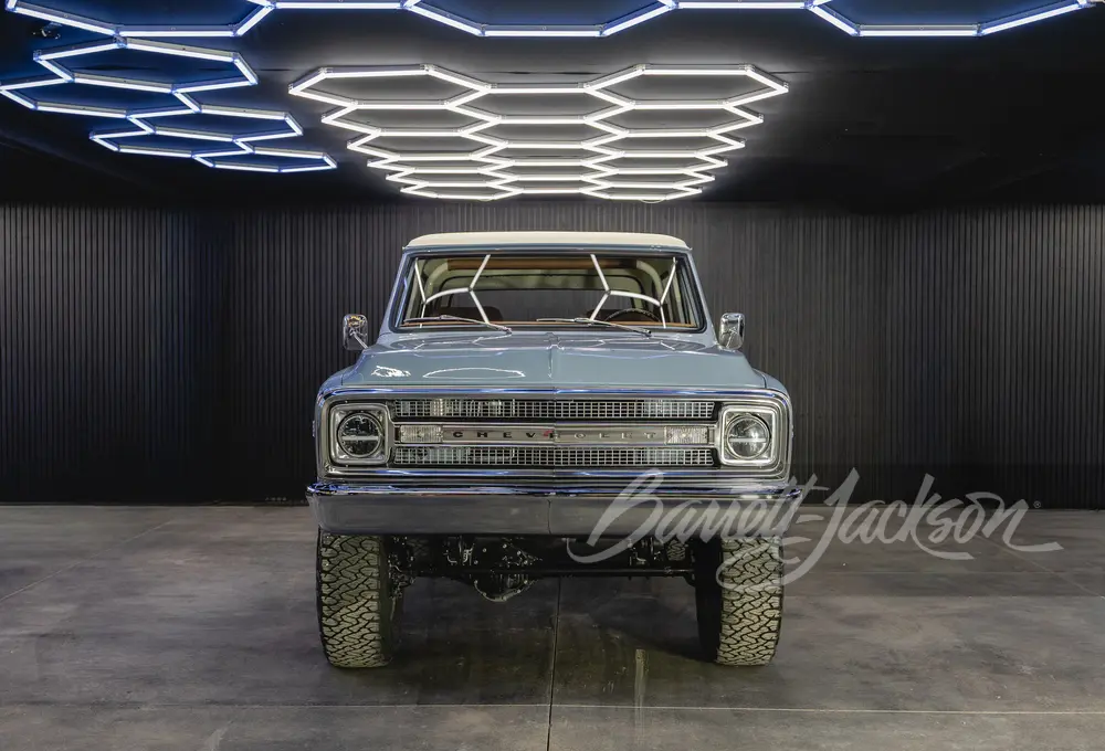This custom 1969 Chevrolet Blazer was built from the ground up as a modern diesel-powered cruiser. Powered by a 3.0L Duramax turbo diesel paired to a 10-speed automatic, it features a stunning light blue and white two-tone exterior with a removable hardtop. The interior is wrapped in brown leather and classic houndstooth cloth, with modern A/C, a digital gauge cluster, and a premium sound system.