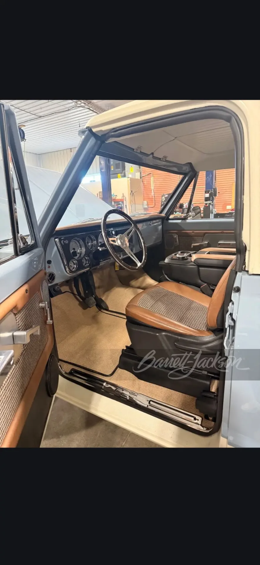 Starting with a complete frame-off restoration, ATP Performance integrated a GM 3.0L Duramax inline-6 turbo diesel for effortless torque and highway efficiency. The 10-speed automatic transmission feeds power through a modern transfer case to upgraded axles. The two-tone light blue and white paint was shot in PPG basecoat/clearcoat for a deep, glossy finish. Interior work includes custom brown leather seats with houndstooth inserts, Dakota Digital gauges, and Vintage Air climate control.